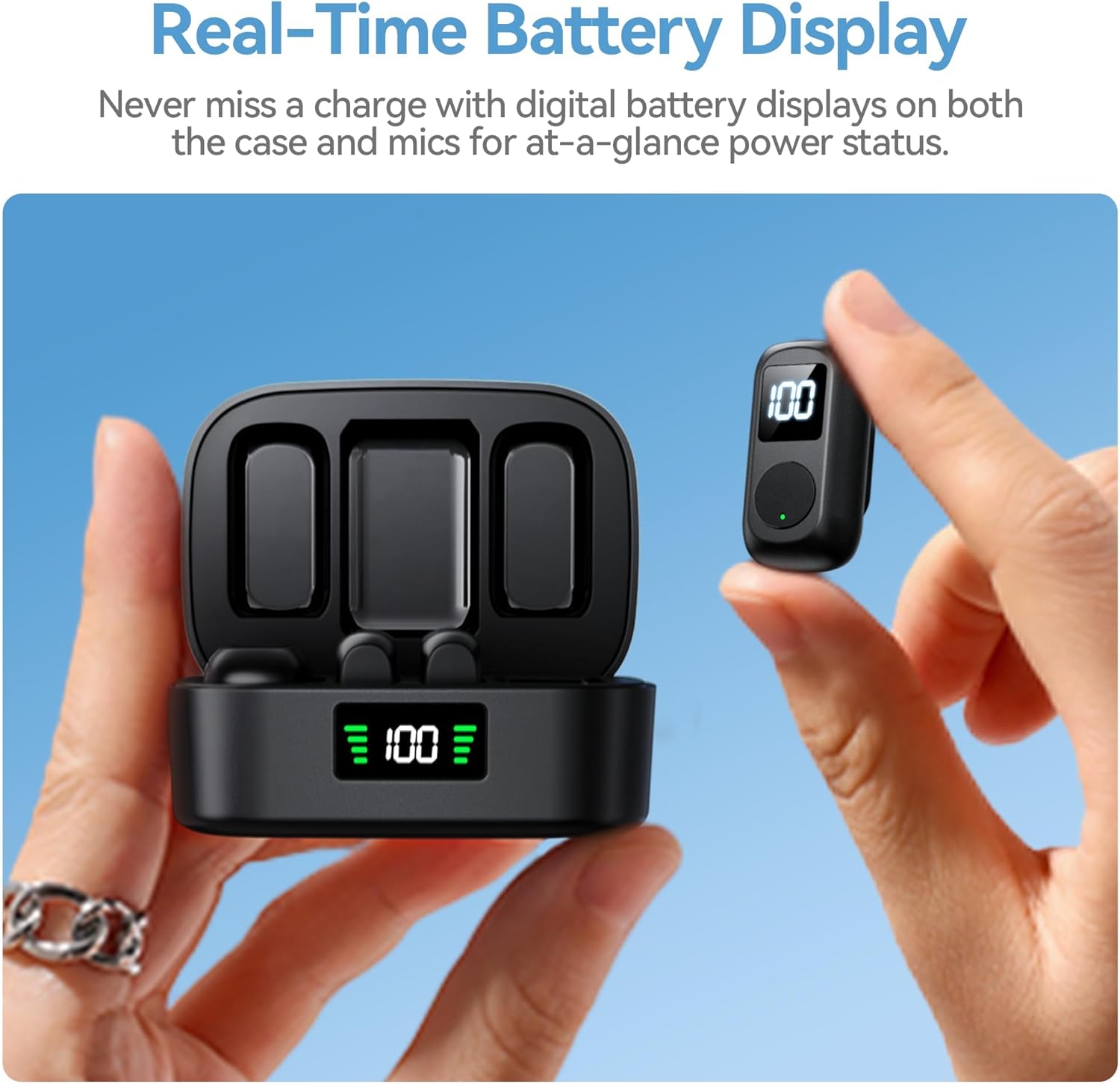• 2. Dual LED Digital Battery Displays: The only wireless lavalier microphone with separate LED digital battery displays on the transmitter and charging case—monitor real-time power levels (0-100%) at a glance to answer "how much battery is left?" The wireless mic delivers 10 hours of non-stop video recording per charge, with the portable charging case extending total use to 54 hours—perfect for all-day video productions, online meetings, and vlogging. Ideal for influencers and classroom educators