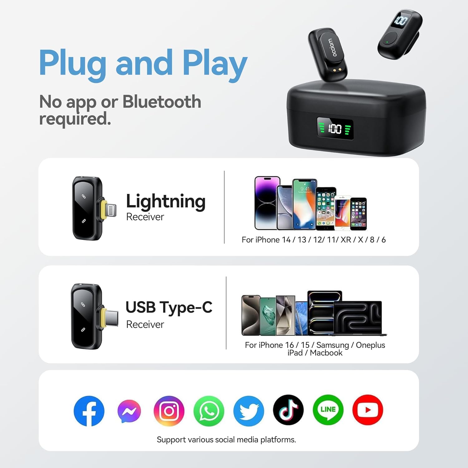 • 4. Charge While Recording: The wireless lav mic’s transmitter powers up via the charging case (USB-C fast charge), while the receiver draws energy directly from your connected smartphone/tablet—no separate charging required for the receiver itself. A dedicated USB-C port on the microphone's receiver lets you charge your phone while recording, ensuring nonstop creation for all-day shoots, outdoor vlogs, or back-to-back interviews. Perfect for mobile creators needing reliable power on the go