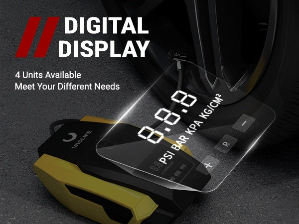 • [High Definition Digital Display Screen] This 12V DC car tire pump is equipped with a high-definition digital LCD display screen, allowing you to have a clearer understanding of tire pressure. There is no need to stop inflating and then use a tire pressure measuring device to measure the pressure separately, checking your car's tire pressure anytime and anywhere. This digital display can measure the tire pressure of KPA, PSI, BAR, KG/CM, and is easy to read in poor light conditions.
